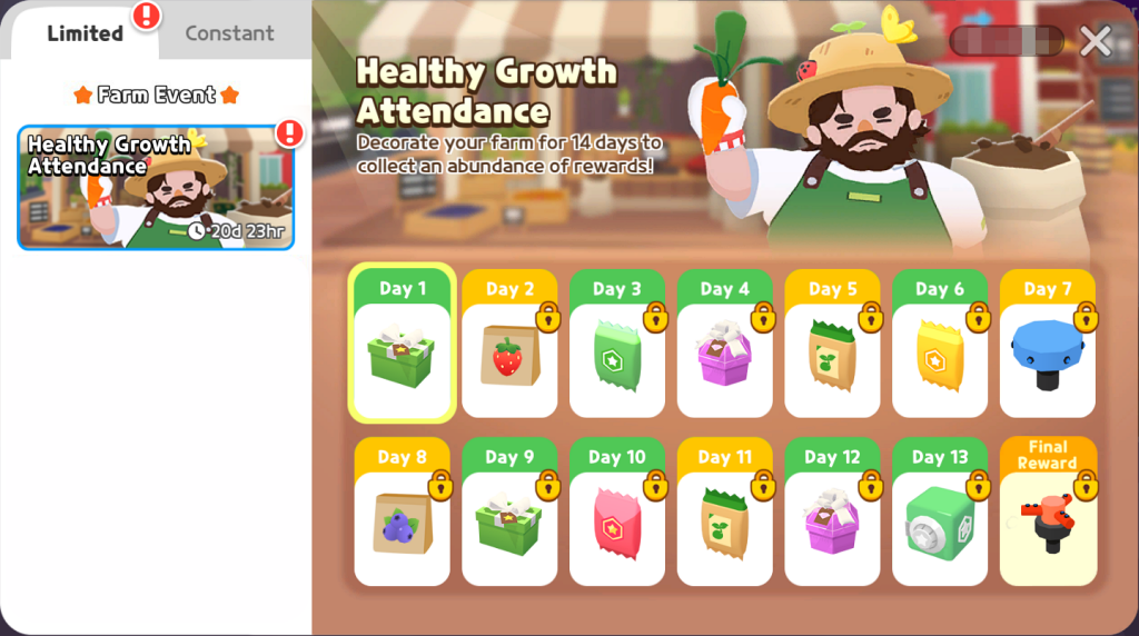 全新簽到簿登場!只要連續登入 14 天,就能獲得能幫助農作物成長的「頂級灑水器」以及裝滿各種種子的「種子包 Vol.1」。