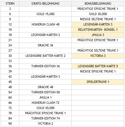– Turnier-Teilnahmebelohnungen können erhalten werden, wenn „Sterne“ erreicht werden. Es gibt Gratis-Belohnungen und „Bonusbelohnungen“, die mit Juwelen freigeschaltet werden müssen.