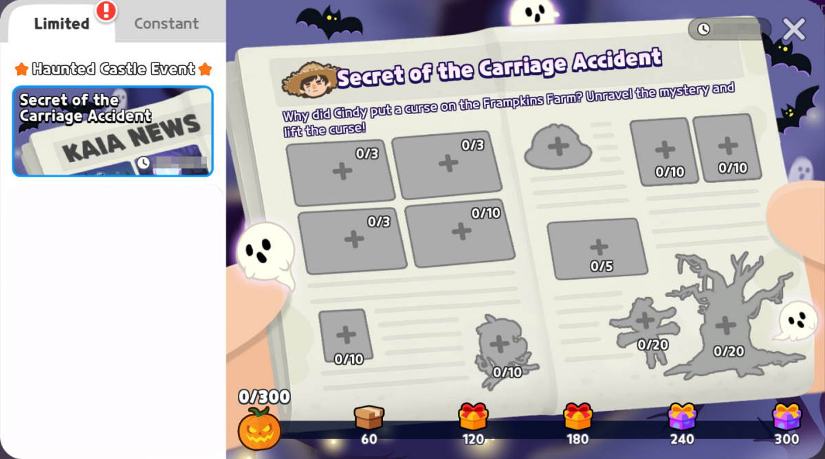 一定数の闇の晩餐を集めると、「呪われた幽霊城」ハウスと「呪われたかぼちゃの馬車」乗り物を獲得できます。