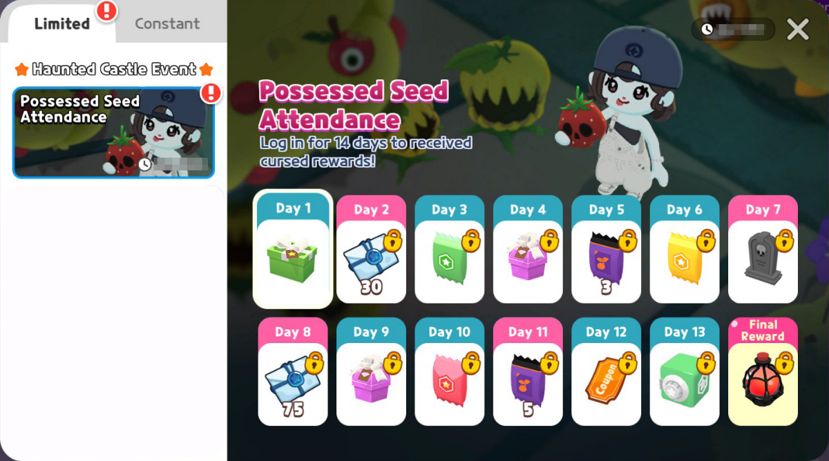 14日間ログインするだけで、「幽霊城への招待状」や「悪霊の種パック」など、悪霊の呪いが込められた特別な報酬を獲得できる出席イベントが開催されます。