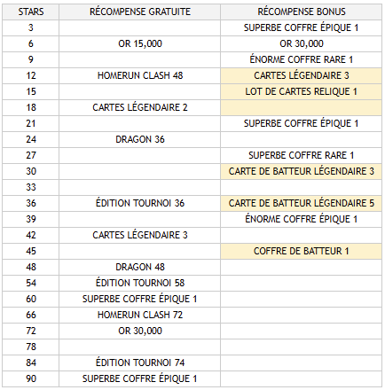 - Les récompenses du Tournoi s'obtiennent en atteignant des « étoiles » et se présentent sous forme de récompenses gratuites et de « récompenses bonus qui se débloquent avec des gemmes.