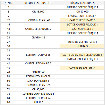 - Les récompenses du Tournoi s'obtiennent en atteignant des « étoiles » et se présentent sous forme de récompenses gratuites et de « récompenses bonus qui se débloquent avec des gemmes.