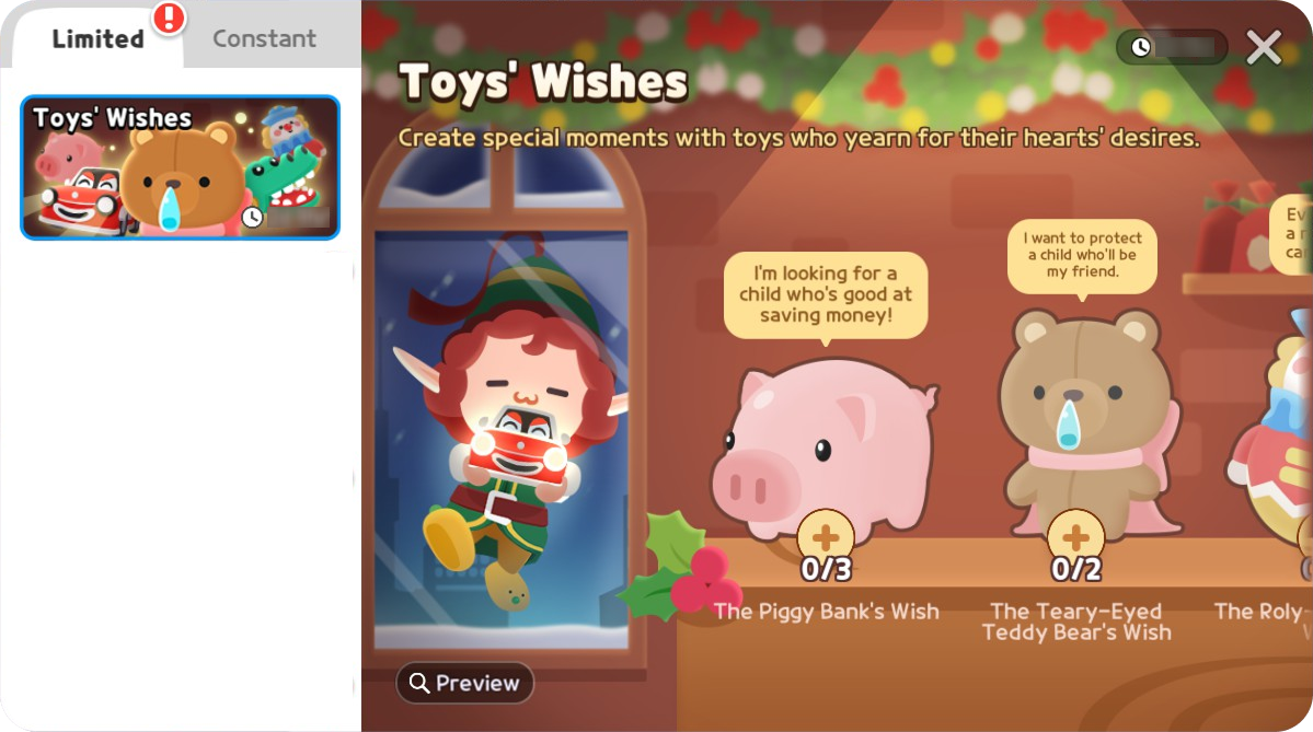 イベント開始日から 1 日につき 1 つずつ公開されるおもちゃたちのお願いを叶えると、