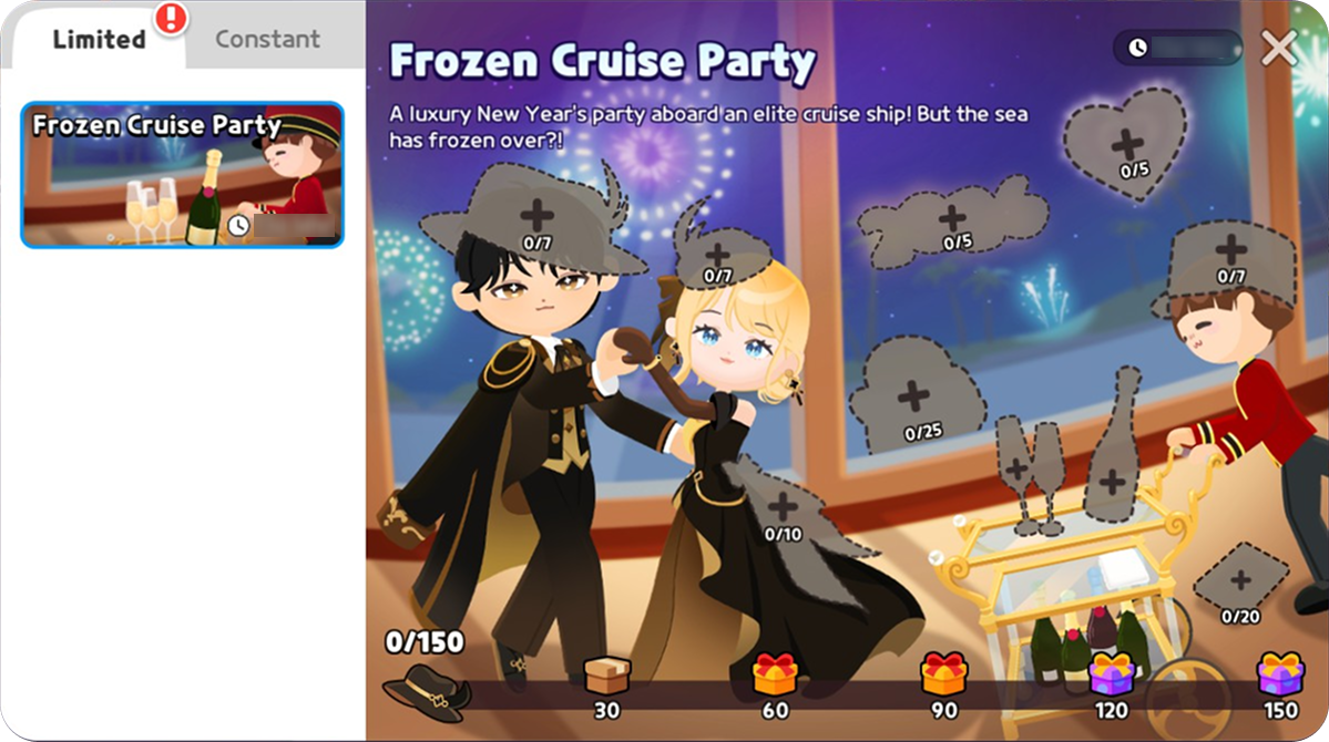 達成段階に応じて、華やかなパーティーの主役にぴったりの「新年パーティーコスチュームセット」や、