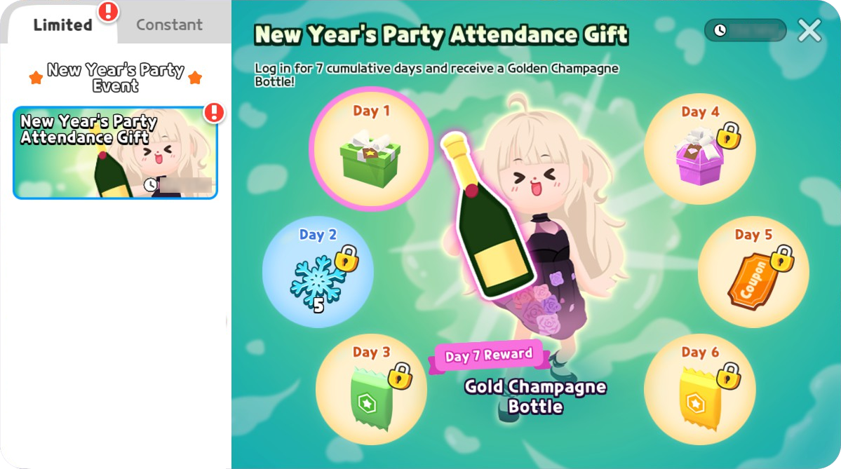 7日間ログインするだけで「ゴールデンシャンパンボトル」「釣りエサの雪花」など、