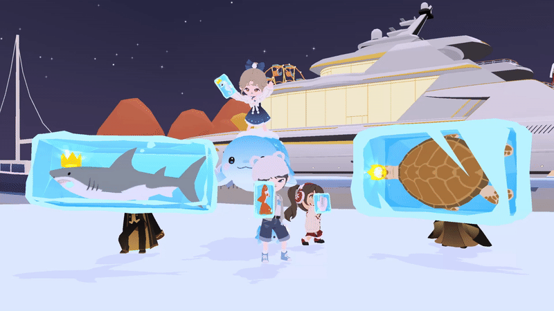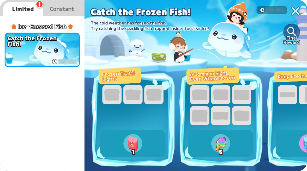 透明な氷の中の氷カチコチ魚をすべて捕まえて、「雪花の妖精カメ」ペットと「氷の釣りキング」名札を手に入れよう!