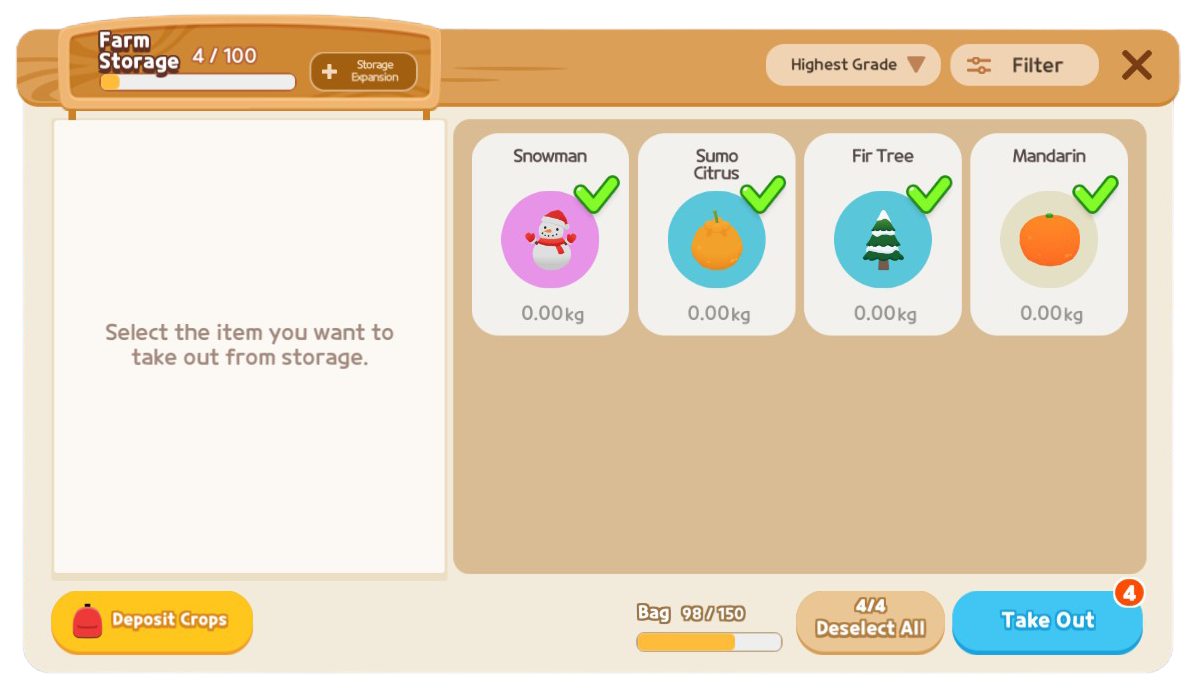 また、倉庫内にカバン果実保管枠の表示が追加され、カバンの空き容量を一目で確認できます。