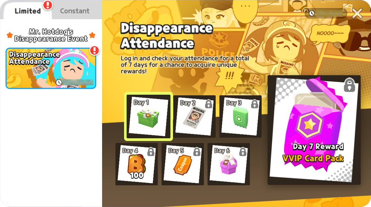 7日間出席するだけで「VVIP カードパック」「ホットドッグマン失踪ポスター(おもちゃ)」