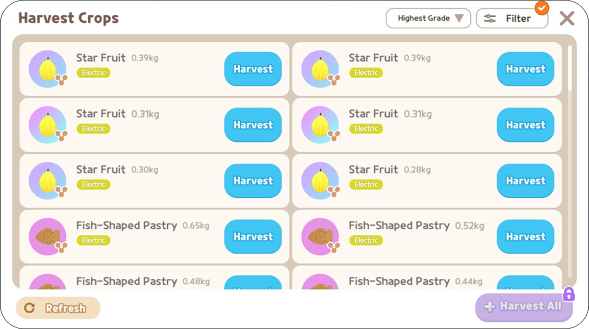 - 並べ替え/フィルター機能で、欲しい果実をより簡単に探せます。