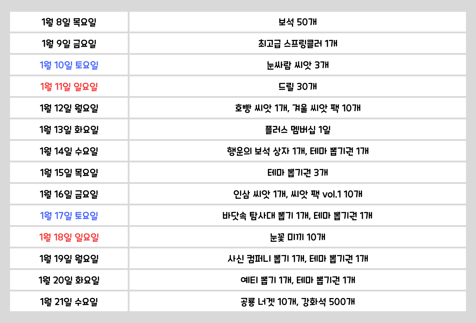 새해를 맞아 카이아섬에서 보내는 하루하루를 더 활기차게 만들 접속 보상 이벤트를 진행합니다. 🏝️✨