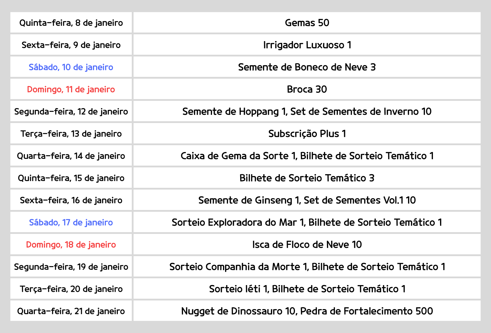 - As recompensas serão enviadas ao Correio todos os dias das 19:00 às 19:00 do dia seguinte, e devem ser resgatadas dentro do período especificado.