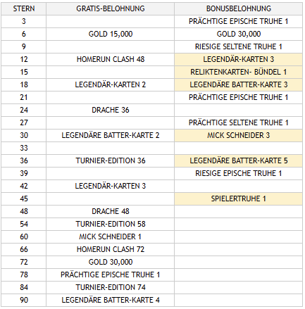 – Turnier-Teilnahmebelohnungen können erhalten werden, wenn „Sterne“ erreicht werden. Es gibt Gratis-Belohnungen und „Bonusbelohnungen“, die mit Juwelen freigeschaltet werden müssen.
