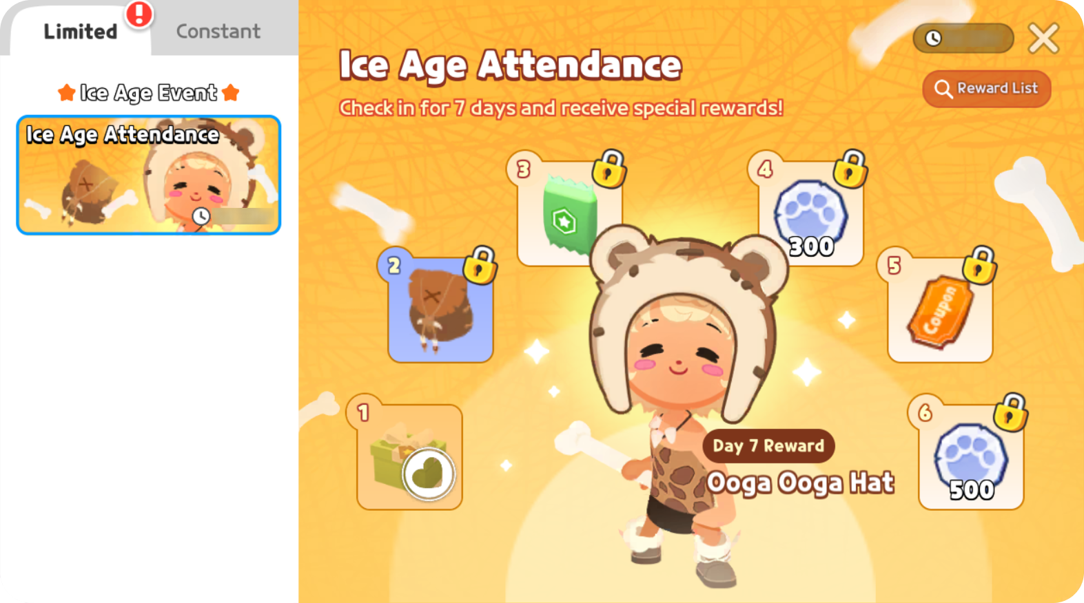 7日間ログインするだけで、ウホウホ帽子、ウホウホバックパック、氷のかけらコインなど、さまざまな報酬を受け取れます。