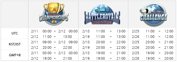 월드 투어는 '월드 챔피언십' '월드 배틀로얄' '월드 챌린지'로 개최국의 피크타임에 맞춰 개최됩니다.
