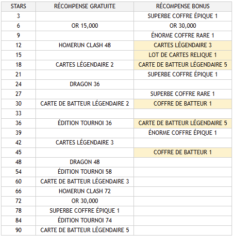 - Les récompenses du Tournoi s'obtiennent en atteignant des « étoiles » et se présentent sous forme de récompenses gratuites et de « récompenses bonus qui se débloquent avec des gemmes.