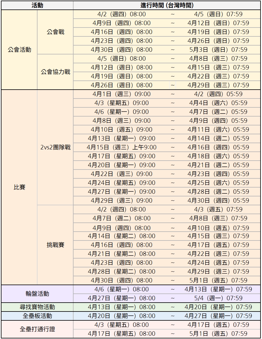 ※ 2vs2團隊戰開始時間: 09:00, 13:00, 17:00, 21:00, 次日01:00, 05:00(進行1小時)