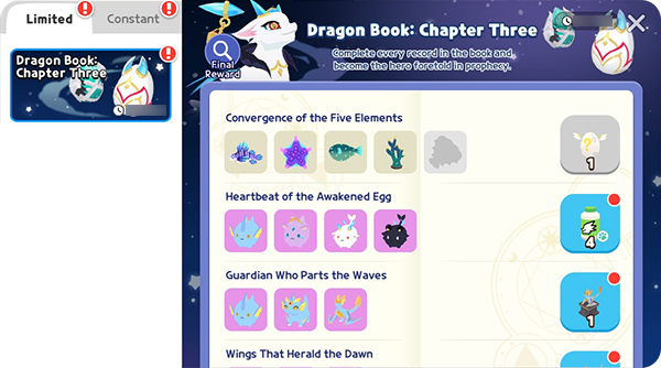 図鑑の完成度に応じて、「ドラゴンの石像5種」、「予言の主人公」名札などの報酬や、